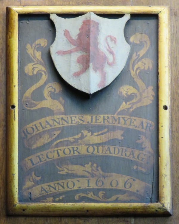 Middle Temple - Dining Hall Coat of arms of John Jermy of Gunton, second son of Robert Jermy of Antingham. Admitted from Cliffords Inn 13 February 1578; Called 30 June 1587; Bencher 1606; Lent Reader 1606; Treasurer 28 October 1614. He was one of the grantees named in the Temple Charter of 1608. Arms: Arg. a lion rampant guardant Gu.