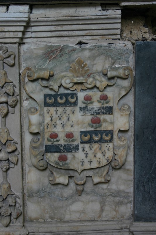 Altar tomb adjoining the north wall of the chancel. The south side of this altar tomb is in three compartments. In the sinister compartment