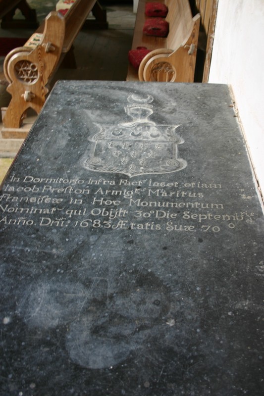 Altar tomb adjoining the north wall of the chancel. On the flat surface of the tomb the inscription In dormitorio infra facto jacet etiam Jacob Preston, Armitgr., Maritus Franciscae, in hoc monumentum nominate, qui obijt 30 Die Septemrbris, Anno D'ni 1683, Aetatis suae 70. Above, cut in the marble, the arms and crest of Preston
