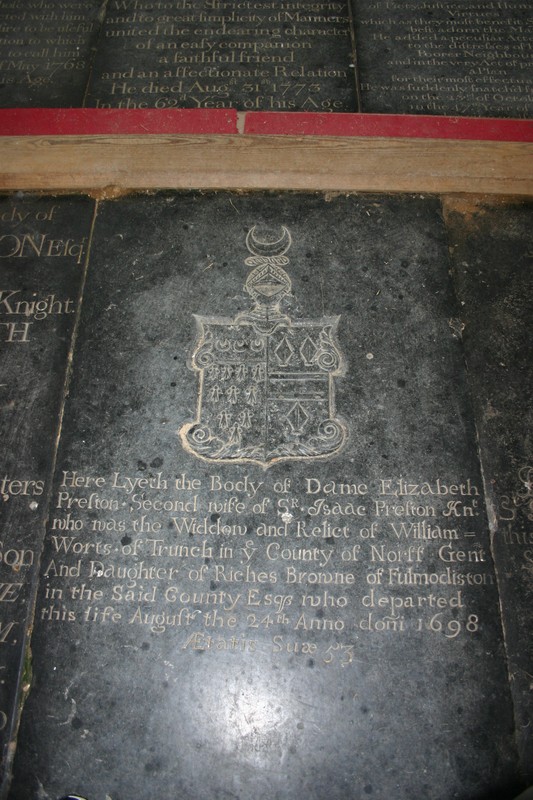On floor of chancel Here lyeth the Body of Dame Elizabeth Preston, Second wife of Sir Isaac Preston, Knt., who was the Widdow and Relict of William Worts of Trunch in ye County of Norfolk, Gent and Daughter of Riches Browne of Fulmodiston in the said County, Esqr., who departed this life August 24th, Anno Dom'. 1698, Aetatis sua 53. Arms above: Preston, impaling two Bars between three spearheads, two in chief and one in base; with crest of Preston