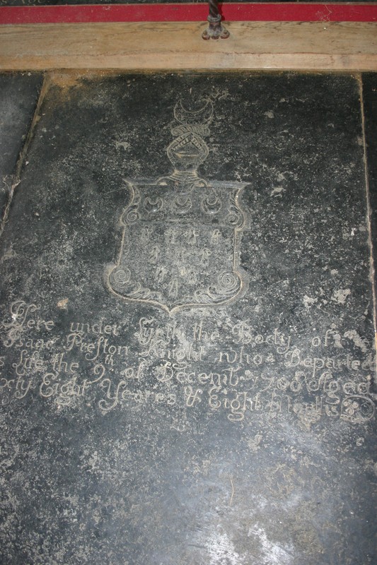 Here under Lyeth the body of Sir Isaac Preston, Knight, who departed this life, the 9th December 1708, Aged sixty-eight years and eight months.