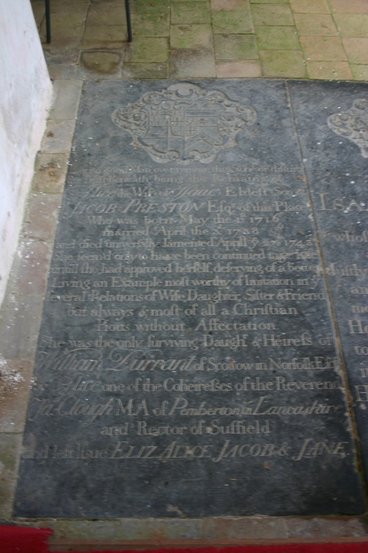 On floor of chancel below previous tablet Let no good man ever remove this stone or disturb the dust beneath, being the Remains of Alice, the wife of Isaac, Eldest son of Jacob Preston, Esqr., of this Place, Who was born May the 1st 1716, married April the 3rd 1738, and died universally lamented Aprill ye 27th 1743. She seem'd over to have been continued in ye Life untill she had approved herself deserving of a better. Living an Example most worthy of Imitation in ye several Relations of Wife, Daughter, Sister and Friend, but always and most of all a Christian, pious without affectation. She was the only surviving Daughtr and Heiress of William Durrant of Scottow in Norfolk Esqr., by Alice, one of the Co-heiresses of the Reverend Ja. Clough, M.A., of Pemberton in Lancashire, and Rector of Suffield, and left Issue Eliz., Alice Jacob, and Jane. Arms above: Quarterly:- 1. Preston, with label of three points for difference; 2. Appleton; 3. Cock; 4. Bond; and escotcheon of pretence, Quarterly, 1 and 4, Durrant; 2 and 3, Clough