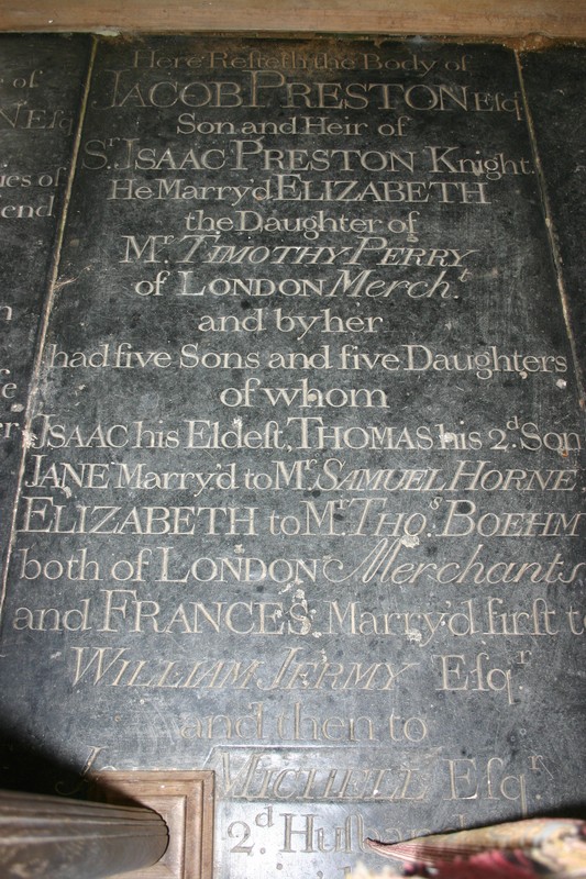 On floor of chancel Here resteth the body of Jacob Preston, Esqr., son and heire of Sir Isaac Preston, Knight. He marryd Elizabeth, the daughter of Mr. Timothy Perry, of London, Mercht., and by her had five sons and five daughters, of whom Isaac, his eldest, Thomas, his 2nd son, Jane marry'd to Mr Samuel Horne, Elizabeth to Mr Thos. Boehm, both of London, Merchants, and Frances marry'd first to William Jermy, Esq. her 2nd. Husband, surviv'd him. He died the 26th of Novr. 1753, Aetat. 80.