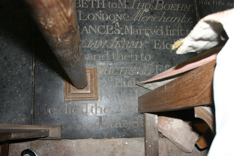 Here resteth the body of Jacob Preston, Esqr., son and heire of Sir Isaac Preston, Knight. He marryd Elizabeth, the daughter of Mr. Timothy Perry, of London, Mercht., and by her had five sons and five daughters, of whom Isaac, his eldest, Thomas, his 2nd son, Jane marry'd to Mr Samuel Horne, Elizabeth to Mr Thos. Boehm, both of London, Merchants, and Frances marry'd first to William Jermy, Esq. her 2nd. Husband, surviv'd him. He died the 26th of Novr. 1753, Aetat. 80.