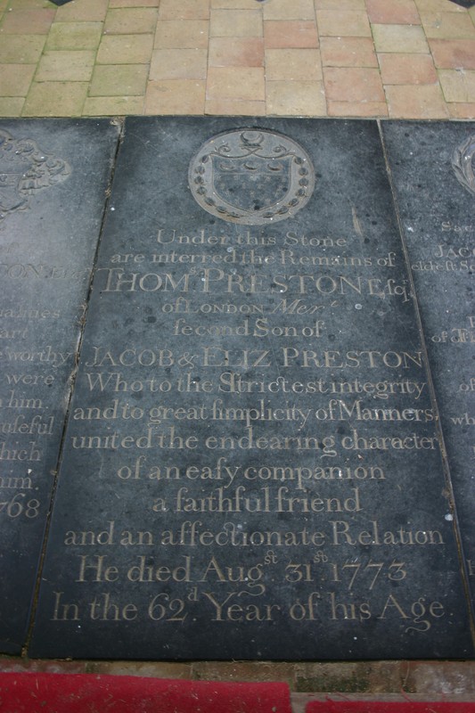 On floor of chancel Under the stone are interred the Remains of Thoms. Preston, Esqr., of London, Mert, second son of Jacob and Eliz. Preston, who, to the strictest integrity and to great simplicity of manners, united the endearing character of an easy companion, a faithful friend, and an affectionate Relation. He died Aug. 31st 1773, in the 62d year of his Age. Arms and crest of Preston above