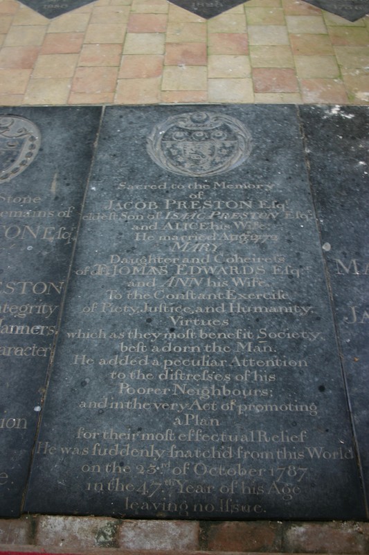On floor of chancel Sacred to the Memory of JACOB PRESTON Esq. eldest Son of ISAAC PRESTON Esq. and ALICE his Wife. He married Aug. 1772 MARY Daughter and Coheir of THOMAS EDWARDS Esq. and ANN his Wife. To the Constant Exercise of Piety, Justice, and Humanity, Virtues which as they most benefit Society best adorn the Man. He added a peculiar Attention to the distresses of his Poorer Neighbours; and in the very Act of promoting a Plan for their most effectual Relief He was suddenly snatched from this World on the 23rd of October 1787 in the 47th Year of his Age leaving no issue. Arms above: Preston, an escotcheon of pretence, per bend sinister ermine and ermines, a lion rampant [or, armed and langued gules] for Edwards