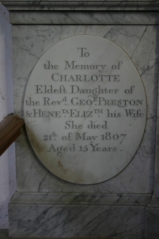 To the Memory of Charlotte, Eldest daughter of the Revd. George Preston, and Heneta. Elizth. his wife. She died 21st of May 1807, aged 15 years.