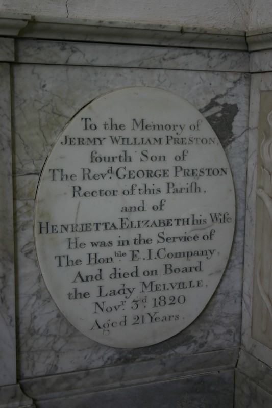 Tablet on the north wall of the chancel To the Memory of Jermy William Preston, fourth son of the Revd. George Preston, Rector of this Parish, and of Henrietta Elizabeth his wife. He was in the Service of the Honble. E. I. Company, and died on board the Lady Melville, Novr. 3d. 1820 Aged 21 Years.