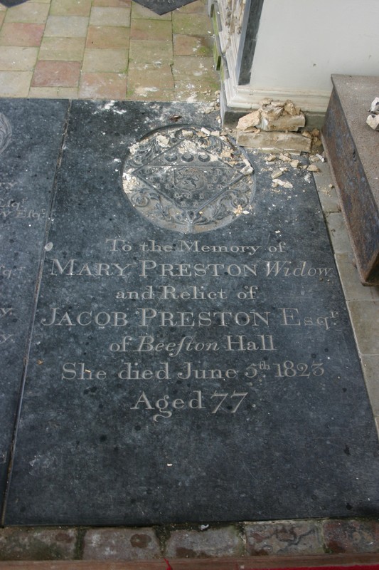 To the Memory of Mary Preston, Widow and Relict of Jacob Preston, Esqr., of Beeston Hall. She died June 5th, 1823, Aged 77.