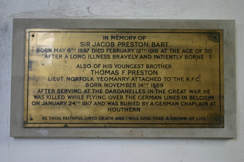 Brass in chancel In memory of / Sir Jacob PRESTON Bart / born May 6th 1883 died February 12th 1918 at the age of 30 / after a long illness bravely and patiently borne / also of his youngest brother / Thomas F PRESTON / Lieut Norfolk Yeomanry attached to the RFC / born November 14th 1889 / after serving at the Dardenelles in the Great War he / was killed while flying over the German lines in Belgium / on January 24th 1917 and was buried by a German chaplain at / Houthern / "Be thou faithful unto death and I will give thee a crown of life"