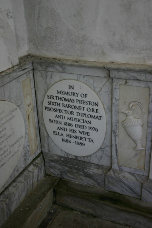 In Memory of Sir Thomas Preston sixth Baronet O.B.E. Prospector Diplomat and Musician Born 1886 Died 1976 and his Wife Ella Henrietta 1888-1989