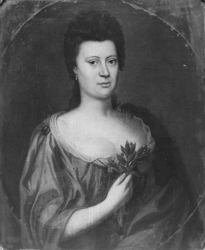 Mary Jermy (ca. 1660 - 1738) A framed oil painting, size 63 x 76 cm. Marks on the painting indicate that it was at one time in an oval frame. Mary is shown with dark brown hair and hazel eyes. She is wearing a green dress with a flame coloured cloak and a pearl earring. She is holding an orange blossom. According to tradition, Mary Jermy was painted in the gown which she wore when she had an audience with Queen Anne. The painting was owned by the Rev. Frank S Bennett (1866 - 1947), the Dean of Chester.