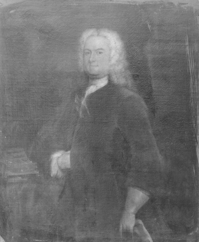 Seth Jermy, junior (1695 - 1745), the son of Seth and Mary Jermy, who was for many years the Secretary to the Commissioners of the Victualling Office. Full length portrait of him standing in a gentleman's brown coat, with white leather gloves, and a black hat under his arm. Wearing a dress sword and a white curled wig. He had hazel eyes, a ruddy complexion and fair hair. It was painted by "Phillips". The painting was owned by the Rev. Frank S Bennett (1866 - 1947), the Dean of Chester.