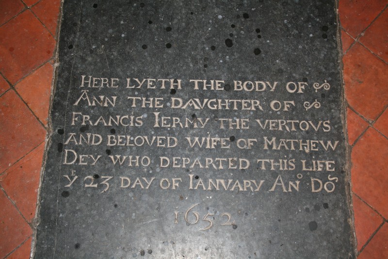 Here lyeth the body of Ann the daughter of Francis Jermy, the vertous and beloved wife of Mathew Dey who departed this life ye 23 day of January An° D. 1652