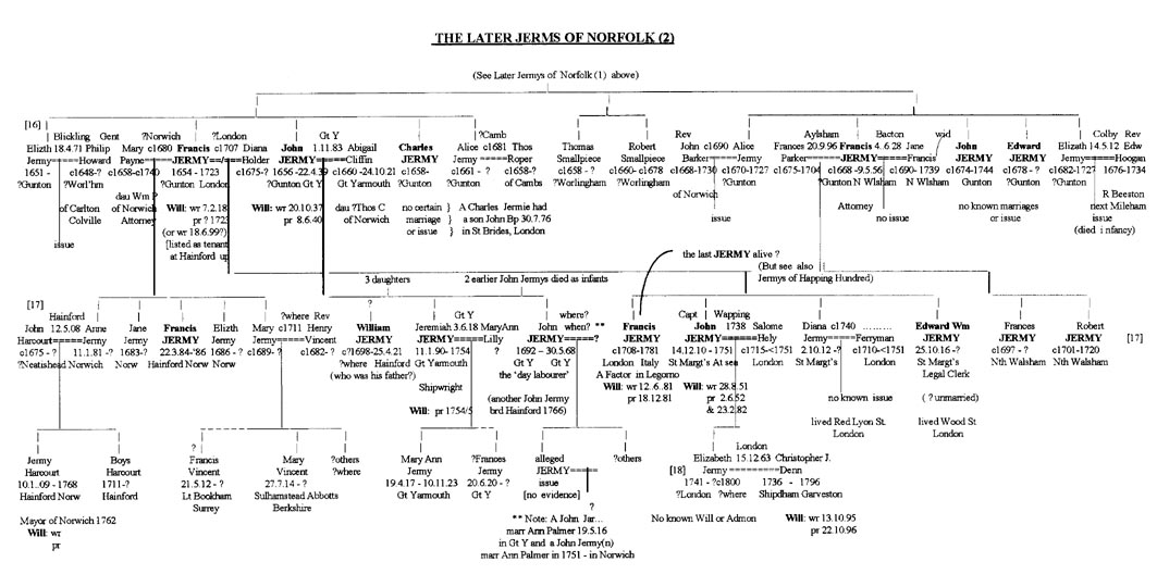 John the Brazier/Yeoman/Landwaiter and his elder brother Francis of Haynford, did have a younger brother - Charles Jermy - about whom nothing is known for certain. He may have died young or, he could have been the Charles Jermie who had a son John (a fitting name) baptised in St Bride’s, Fleet Street (near Chancery Lane) on 30 July 1676 - where an uncle Edward Jermy worked as a Legal clerk just before this. However, the Gunton Charles seems a touch too young to be confidently represented by this latter Charles, although he is difficult to account for otherwise. (Or was he a twin brother of John Jermy of Yarmouth (b c1656/7)?) He would have received his £200 as well. Did this son John Jermie marry and have issue - ca 1700-15? And did such issue include another John Jermy (born c1715) - who ended up in Oxfordshire ca 1735?? Did he have a brother Abraham? Finally, John Snr also had a younger sister - Alice - who married Thomas Roper of Cambridge (of an apothecary’s family) in the early 1680s. One wonders if their mother Anne (nee Castleton) may have retired to live with this daughter and possibly die there - if not with her other daughter Elizabeth Howard in Carlton Colville (where the registers were destroyed pre-1710 and missing post-1710)? She doesn’t appear to have re-married - having little or no viable property left her by John Jermy (d 1663) - nor leaving any Will apparently. She likely did receive some of the proceeds from the sale of Marlingford, however - around 1680. She did live for a time in Bury St Edmonds. [Try Suffolk Wills.]