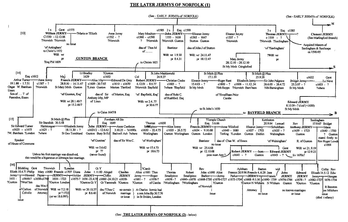 The second surviving son of John was Robert Jermy - born in December 1601 (I believe in Norwich also) where he too would have been educated before entering the same College at Cambridge in about 1620. (Both brothers also received some education at the Middle Temple where their father had been Treasurer and Master of the Bench.) Robert, who was called to the Bar in 1629, married before his brother - in Sept 1627 in Norwich - to Christian Cocke, daughter of Robert Cocke of Rushford, Esq, in the south of Norfolk. (Interestingly, the Cockes appear to have acquired the former ancient Jermy estate at nearby Tharston et al sometime before this). Robert would soon reside at Bayfield (near Holt and Saxlingham) - possibly as a tenant of his brother initially) and have 3 sons and 6 daughters there over the same period as Francis was having his equally large family at Gunton - before and into the years of the Civil war. (A Complaint was brought by brothers Francis and Robert Jermy in 1638 as joint Lords of the Manor of East Ruston (near the north coast) inherited from their father John in 1630. Other early Jermy property was held at Worstead; both may have been outlying elements of the Gunton Manor (Netherhall). Intriguingly, Ingham, Hickling and Runham with later Jermy connections (ie about 50 years later) was also nearby; these properties may have provided a 'lifeline' to the remnants of the Marlingford family, with the main Marlingford manor having been sold out of the family around 1670. There was also a Robert Jermy/Jarmy at Worstead a little later whose possible connection needs verification.) Today, East Ruston boasts a much visited horticultural garden.