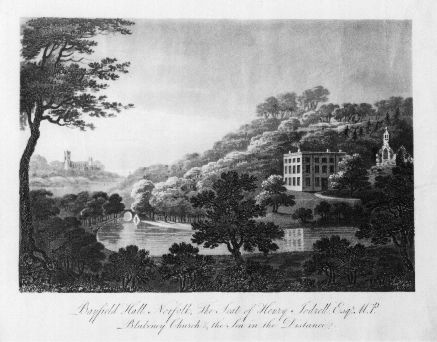 Bayfield Hall, Norfolk. The seat of Henry Jodrell, Esq. M.P. Blakeney church & the sea in the distance