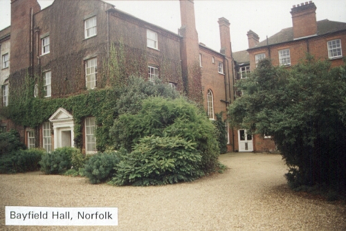 Bayfield Hall The manor of Bayfield in the fifteenth, sixteenth and seventeenth centuries belonged to the Clere and Yelverton families. The estate was acquired from the Yelvertons circa 1620 by John Jermy of the Middle Temple and of Gunton. The family was strongly on the side of Parliament in the Civil War. To this John must be attributed the original E-shaped house with mullioned windows and central porch, and wings to which shaped gables and quoins were added in the late 17th century. The last of the Jermys to own the hall was William, High Sheriff in 1748, who dying in 1752 left a widow Frances (nee Preston) who subsequently married John Michell, a wine merchant of Boston, Lincolnshire. He died here and was buried at Letheringsett in 1776, but sixteen years later was removed to Forcett in Yorkshire. It was about this time that Henry Jodrell, barrister and Recorder of Yarmouth purchased the property and built the present hall, with part of E-shaped house embedded in it. Ref: Cozens-Hardy, B. 1961. Some Norfolk Halls. Norfolk Archaeology. 32. 163-208