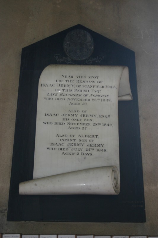 Near this spot / lie the remains / of ISAAC JERMY, of Stanfield Hall., / in this parish, Esq / Late Recorder of Norwich / Who died November 28th 1848 / Aged 59 Also of ISAAC JERMY JERMY, Esq / his only son / Who died November 28th 1848 / Aged 27 Also of ALBERT / infant son of / ISAAC JERMY JERMY / Who died July 24th 1848 / Aged 2 days |