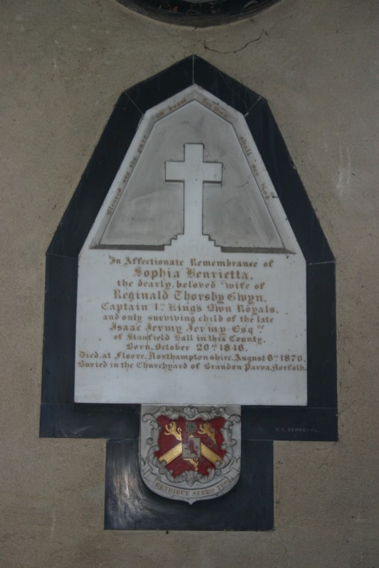 In Affectionate Remembrance of / SOPHIA HENRIETTA / the dearly beloved wife of / REGINALD THORSBY GWYN / Captain 4th King's Own Royals / and only surviving child of the late / ISAAC JERMY JERMY Esq., / of Stanfield Hall in this County / Born October 20th 1846 / Died at Floore, Northamptonshire, August 6th 1870 / Buried in the Churchyard of Brandon Parva, Norfolk |