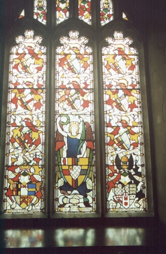 Eleven shields in a three light stained glass window south of the nave, showing the heraldry of the Broke family.