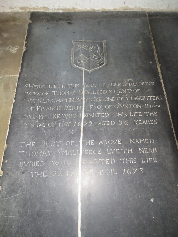 Ledger stone in the floor of the tower. Here lieth the body of Alice Smallpeece wife of Thomas Smallpeece Gent: of Worlingham in Suffolke, one of ye daughters of Francis Jermy Esq: of Gunton in Norffolke who departed this life the 26th day of May 1672 aged 36 years. The body of the above named Thomas Smallpeece lyeth near buried who departed this life the 22nd day of April 1673.