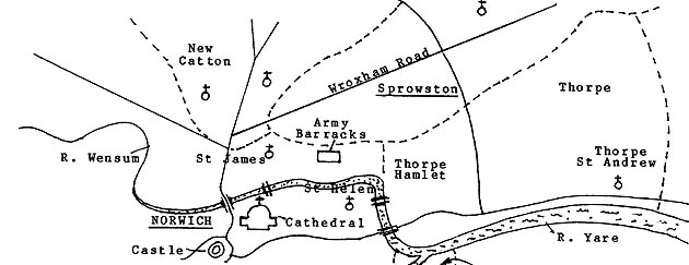 The Census record showed the presence of 3 children in the home on Mill Lane: James, Mary Ann and William. One was expecting Sarah Ann and John as well but, being born in 1823 and 1830, respectively, these last two - then about 28 and 21 - may well have left home. William would be a 5th child presumably, born sometime after John - the last born noted at Sprowston. But then James Jnr. and his sister Mary, born in 1825 and 1827, would themselves now be aged 26 and 24 and yet hadn’t themselves left home. In James’ case, this was quite explainable in that we knew he was due to marry two years later. However, on checking the listed ages for these latter two, we discovered that James wasn’t in fact shown as 26 - which he should have been if born, as we had noted, in 1825 - but only 19. And Mary wasn’t 24, but considerably younger at only 14. William, younger still at just 10, was thus born about 1840. Moreover, all three were shown to be born not in Sprowston but in Thorpe - a neighbouring parish to the south just across the river Yare from the Norwich parish of St. Helen (see map).