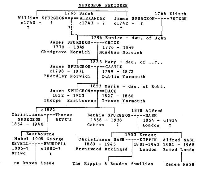 It thus appeared that William and James Spurgeon were two brothers who settled in the Loddon - Chedgrave area around 1765 or so. Neither was born or married there. William’s wife appears to have been the Sarah Alexander who married William Spurgeon in 1765 in Mendham, near Bungay, Suffolk - a few miles south of Mundham and Loddon, etc. The eldest James Spurgeon’s wife appears to have been Elizabeth Nixon - a couple with these names having married in Mulbarton in January 1766. As they had no children subsequently baptised there, a move shortly after to the Loddon-Chedgrave area - possibly to join his brother - would seen the most reasonable conclusion. The Spurgeon pedigree leading to Christianna Nash and beyond can now be set out as follows: